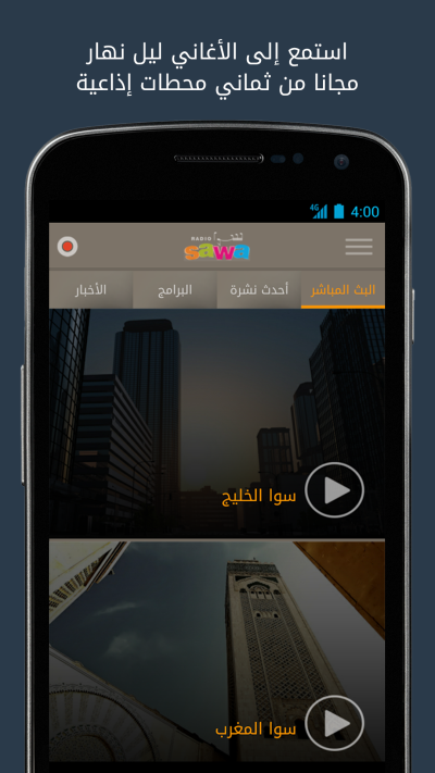 The official, free Radio Sawa application serves you the best Arabic streaming music experience through 8 different Middle East and North African channels to your Android phone or tablet. The interface is simple to use and swipe quickly through to switch channels, as well as listen to audio programs on-demand, read quick news stories and send audio comments to be aired on the radio programs.